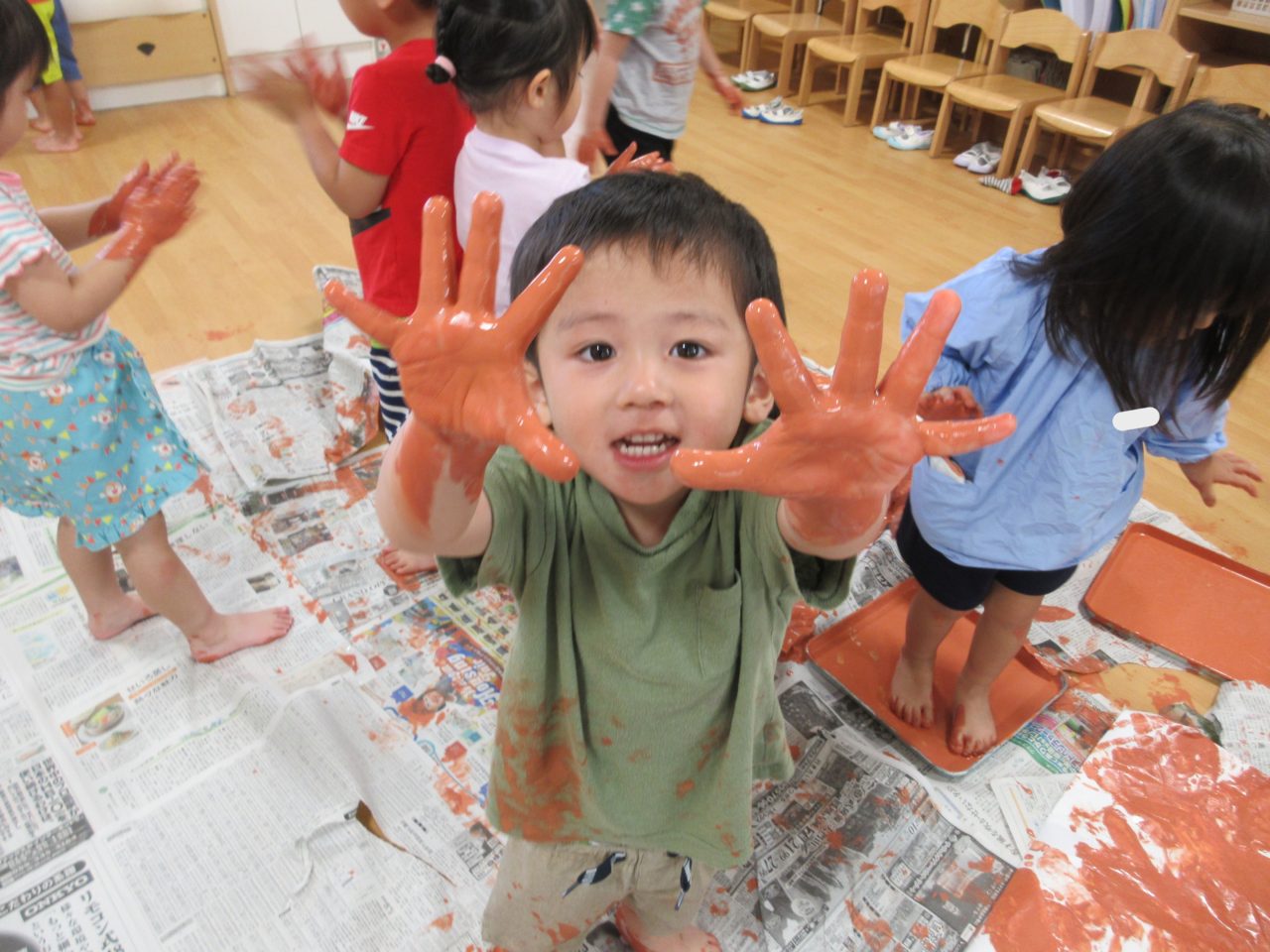大きな模造紙に手や足を使ってダイナミックに絵の具を塗りました。自分の手形や足形に喜んでいました☆