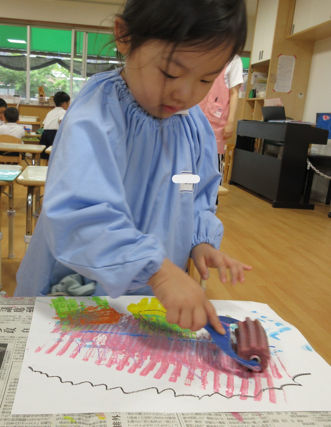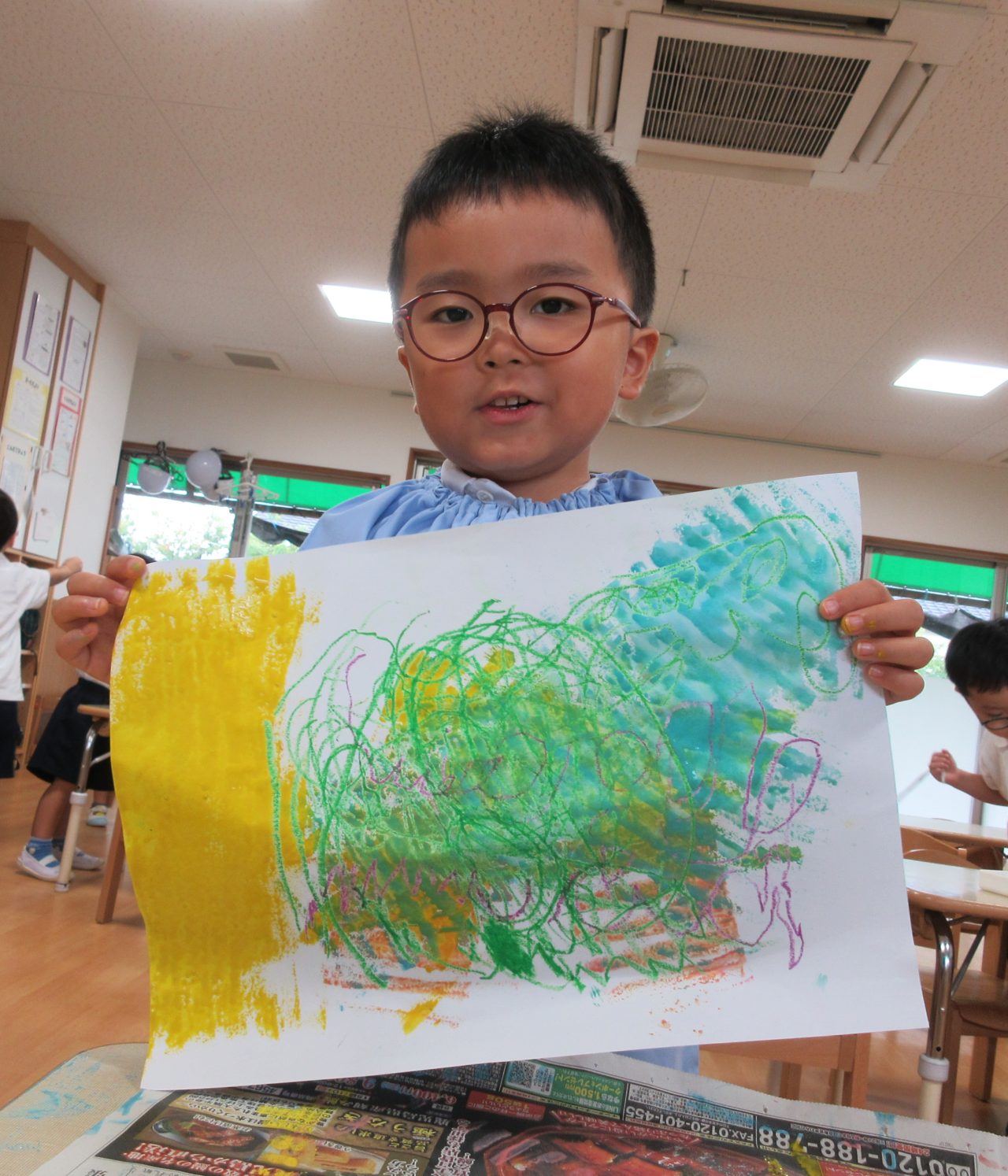 紙にクレパスでお絵描きをした上に絵の具を塗りました。なんと絵の具を塗っても絵が消えない!!子どもたちは「ふしぎ~」と声をそろえて言っていました。