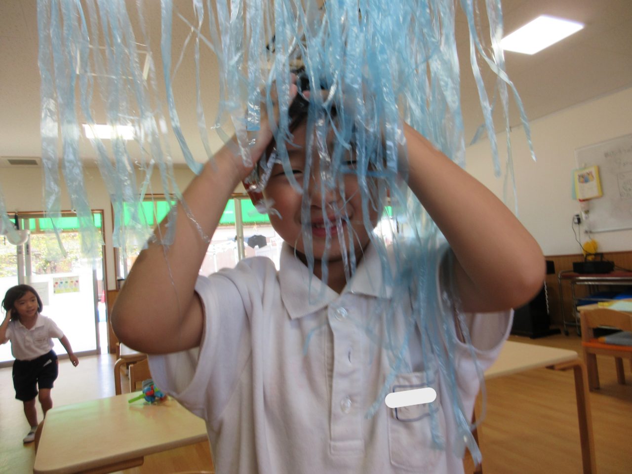 すずらんテープを使って・・・夢中になって裂く子どもたち。
