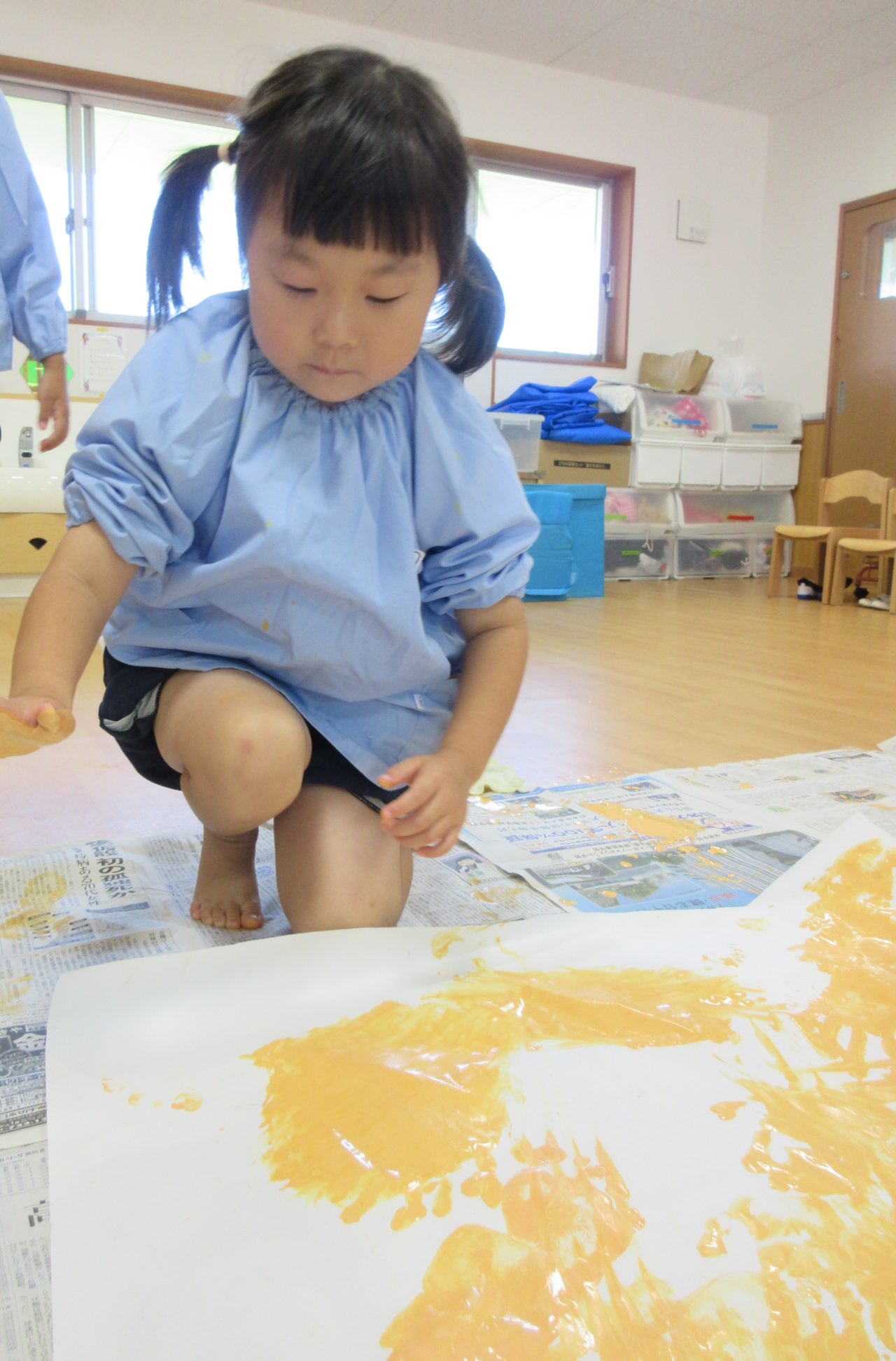 大きな紙に向かってダイナミックに絵の具を塗ることに大喜びでした!!