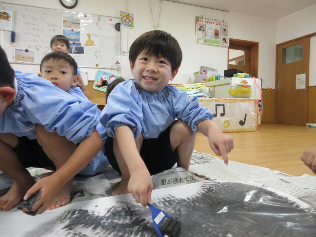 「砂がいっぱいだね!!」「ここぬれてないよ!!」と夢中で色塗り!