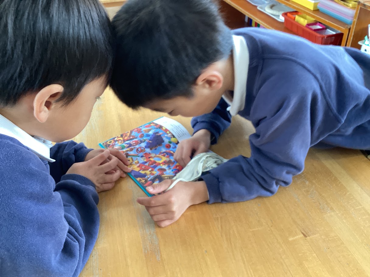 迷路や描いてあるものを探して見つけたりする絵本も人気で、友達と一緒に絵本とにらめっこになり、夢中になっています。