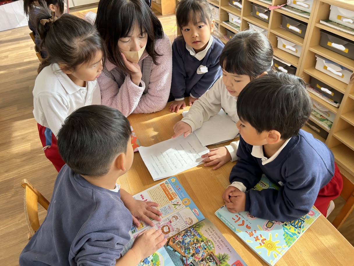 文字が読めるようになった子は、自分で絵本を見て、一文字づつ真剣に読んでいたり、