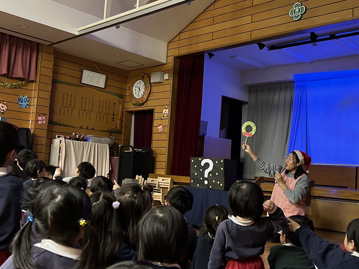 スクリーンに映し出された形を見て、ツリーのような簡単な問題や少―し難しい問題も・・・リースには「ドーナツ?」や「リング?」など、回答を悩んでいた子どもたちの姿も(=^・^=)