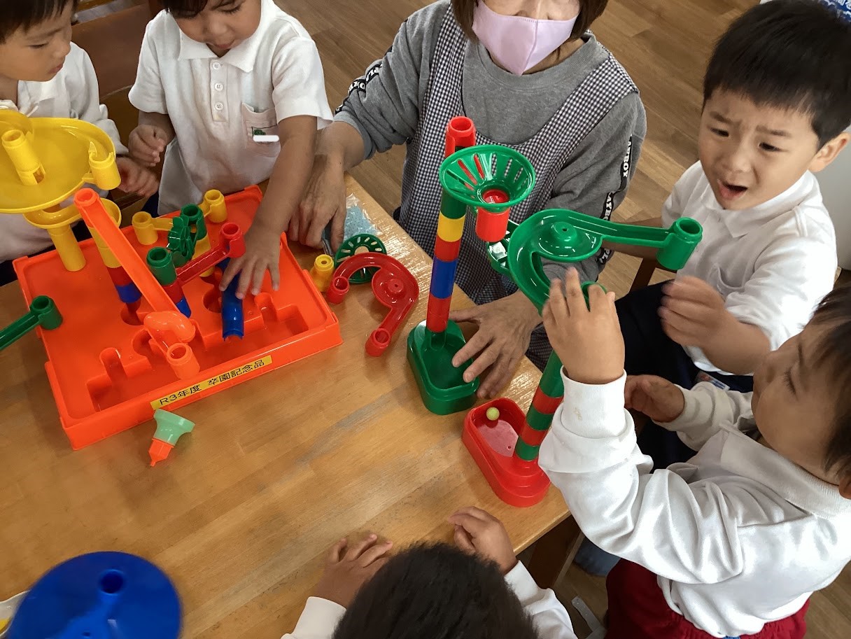 幼児クラスのお部屋で遊ばせてもらうと、いつもと違う玩具に興味津々の子どもたちです。