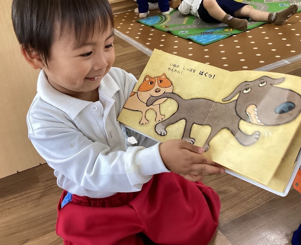 保育者を真似て、絵本の読み聞かせをしてくれる、ももぐみさん。文字は読めなくても日頃から保育者が読んでいる内容をしっかり覚えて、絵を見て話しいます。
