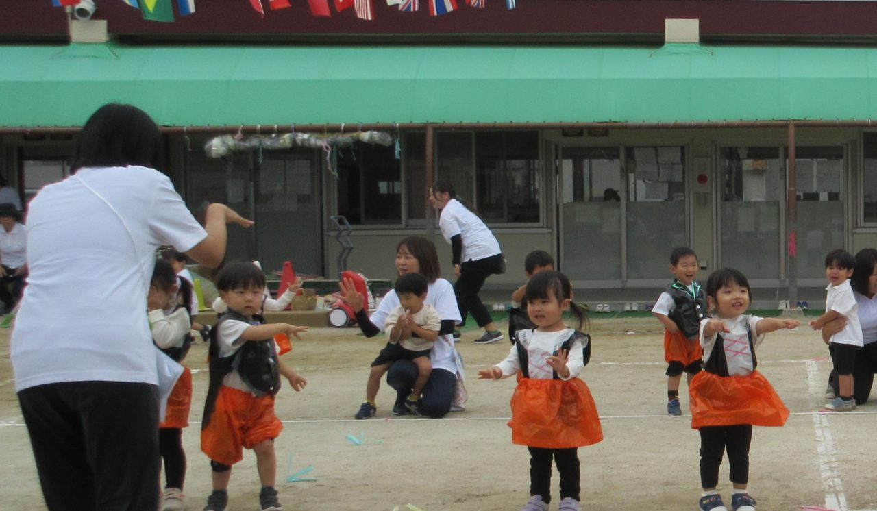 第1部:2歳・年少の子どもたちは、初めて運動会に参加する子も多い中、緊張しながらも頑張って参加することができました。ごほうびメダルをもらってにっこりです☺
