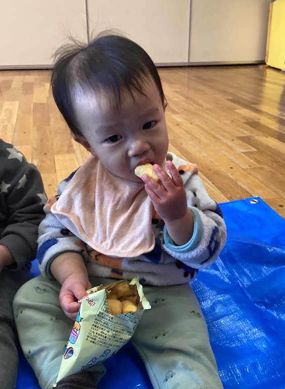 0.1歳児は、遊戯室でブルーシートを敷き、遠足気分でおやつを食べました!