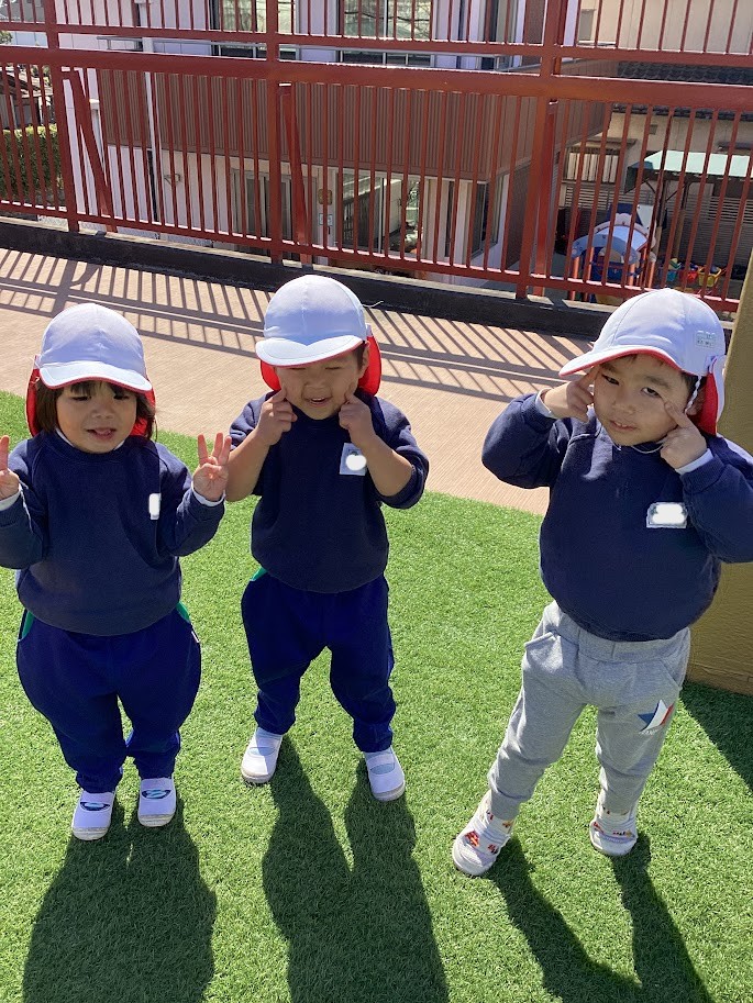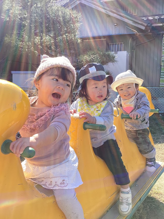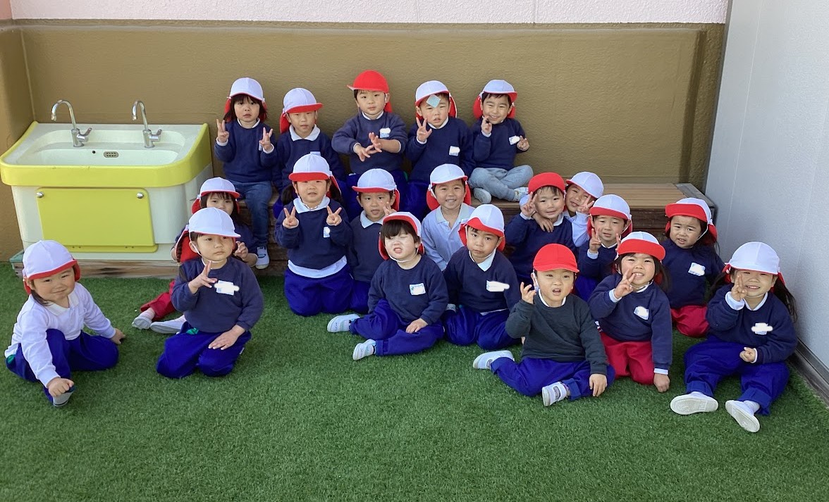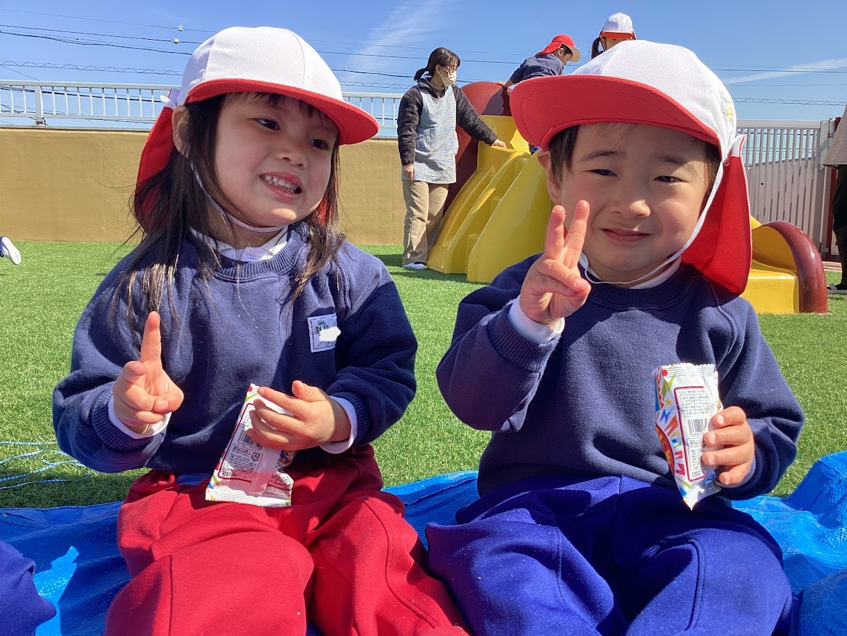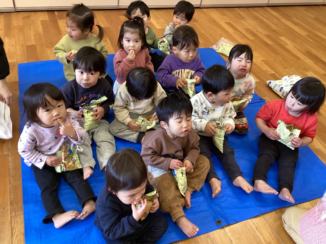 3歳未満児さんも、3月のお天気の良い日にみんなで一緒におやつを食べたり、グリーン広場で遊んだりして