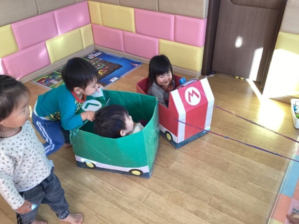 運動会は終わりましたが、親子競技で使ったマリオカートを出すと中に入ったり、カートを嬉しそうに引いたりする姿も見られます。また、「ピーピッ」というと「ワン.ツー.スリー.フォー!」と幼児さんの真似をしたりと、まだまだ運動会の気分が抜けない子どもたちです☆