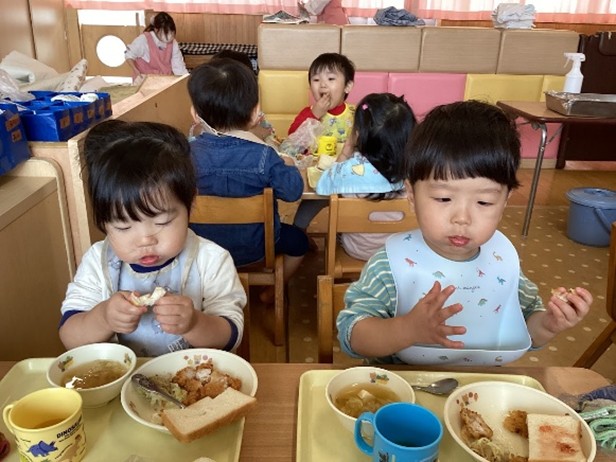 「美味しいよ!」とお友だちや保育者と会話しながら食べる給食の時間はとっても楽しいですね!