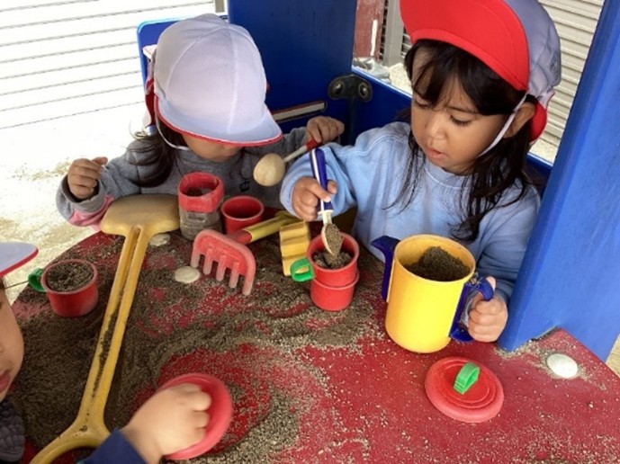 砂場に一目散に走っていき、「一緒にお山作ろ~」とお山を作ったり、「いらっしゃいませ~」とお店屋