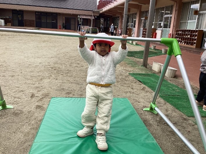 また、鉄棒や雲梯にも少しずつ挑戦する子が増えてきました。上手にぶら下がることができると先生を呼んで嬉しそうにやって見せてくれる姿もかわいいです♡