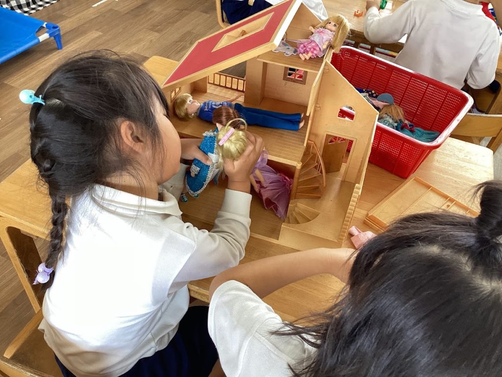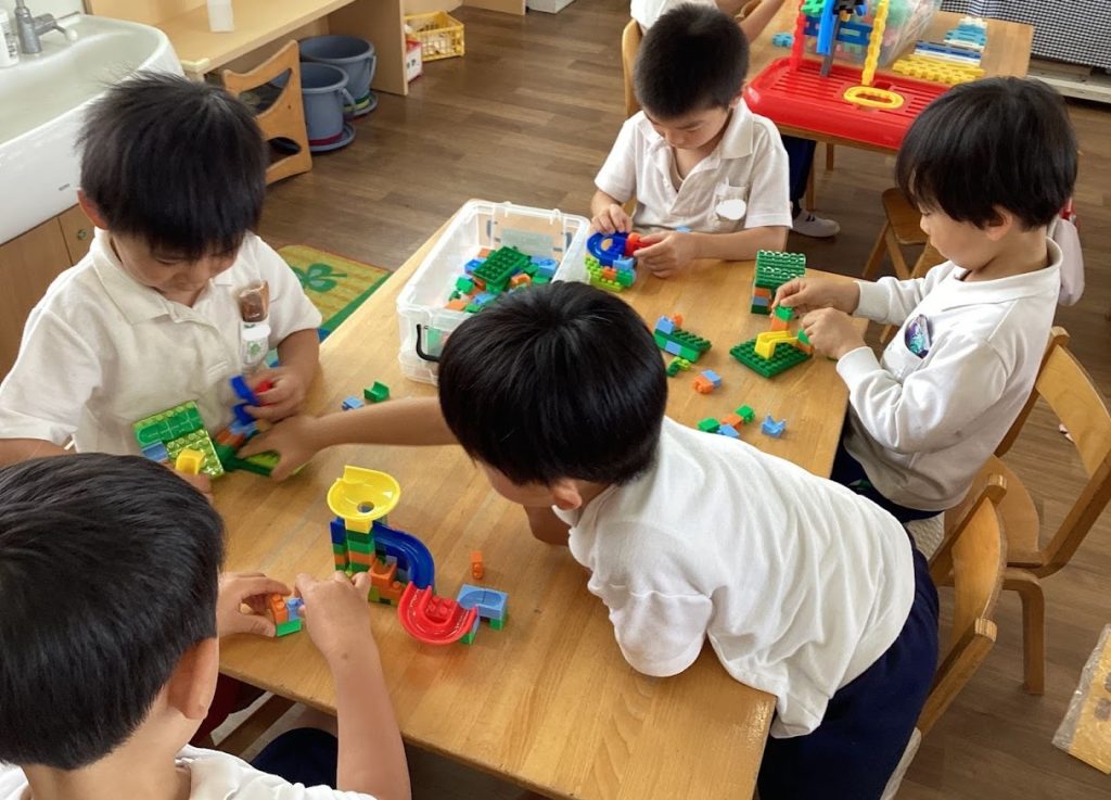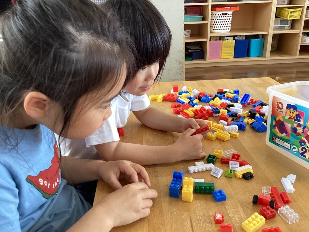 あおぐみのお部屋の自由遊びの時間に、子どもたちがそれぞれ自分のやりたいことを見つけ、友達同士で遊んでいます。