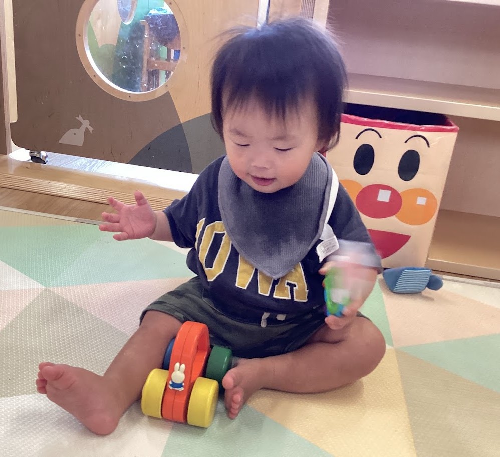 お部屋にあるニョロニョロのぬいぐるみに乗って、「ゴーゴー」と言っているUちゃん。バスに乗ってかな?と思い、歌ってみると・・・