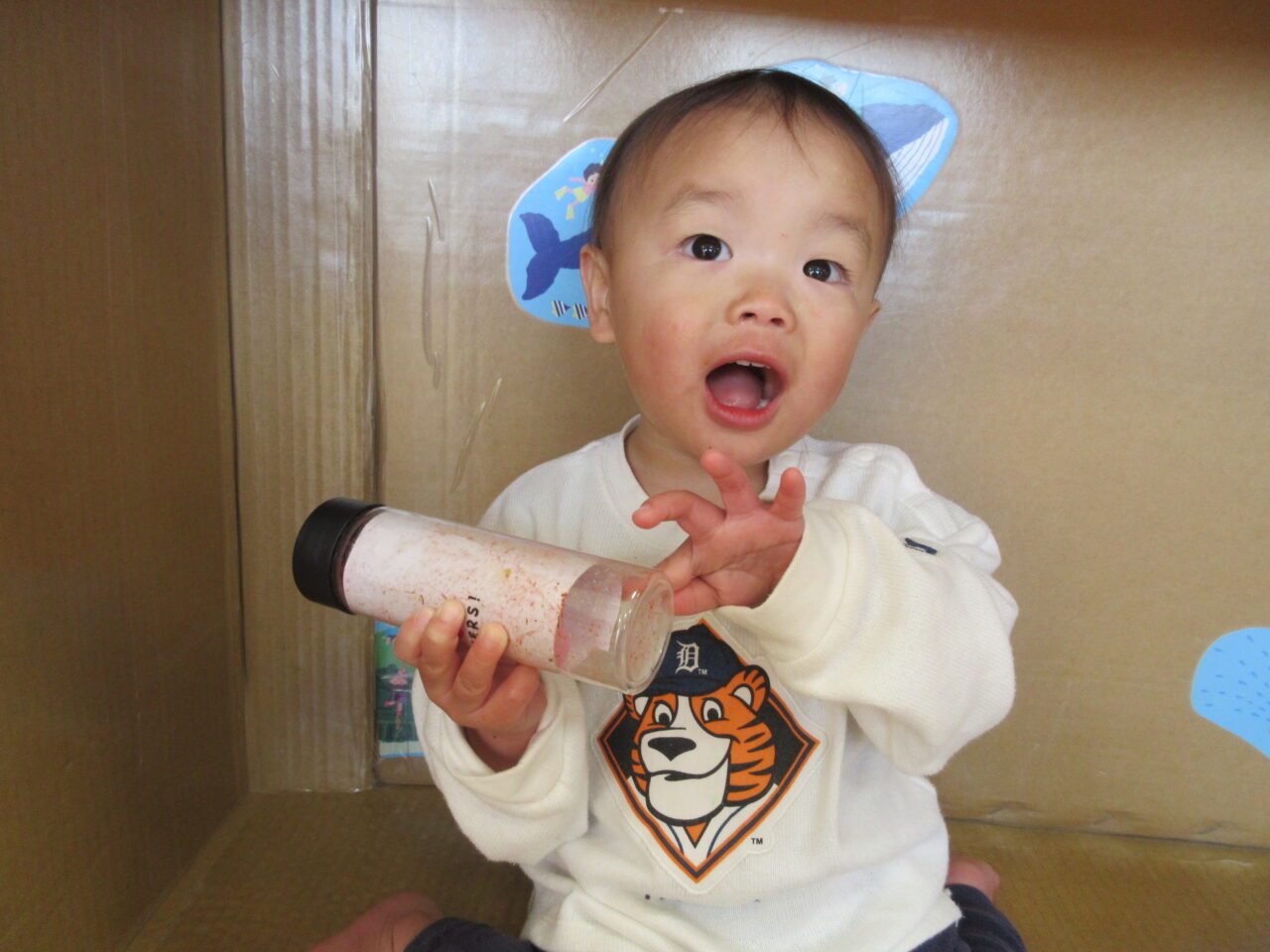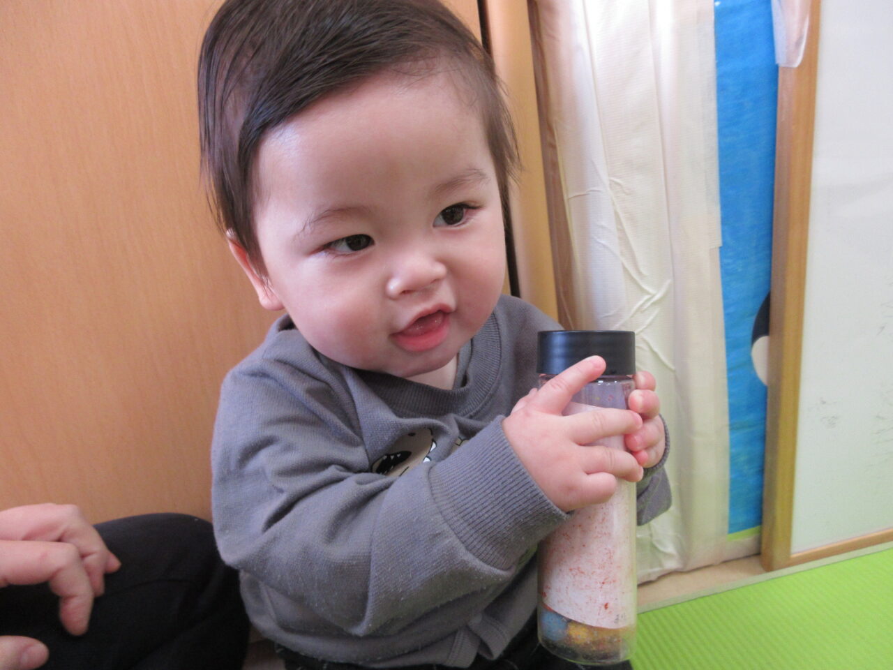 まずは小さなボトルの中にクレヨンと紙を入れて、フリフリ☺