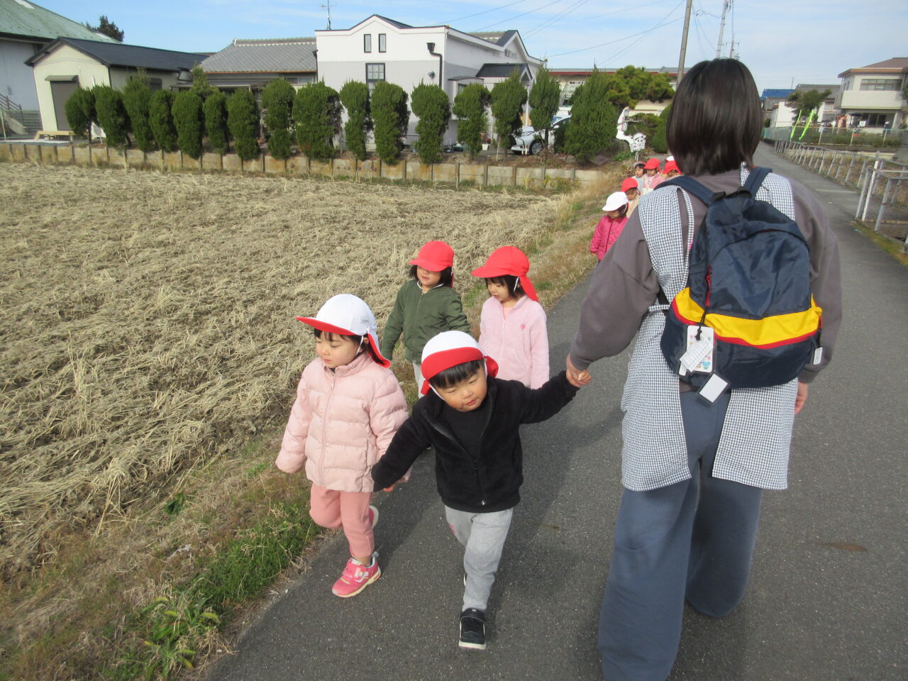 あぜ道に生えている草花や飛行機、車を見つけるとお友だちや保育者に「見て見て!」と教えてくれたり、一緒に歌を歌おうと誘ってくれたり…話声が止まらない楽しいお散歩となりました✨