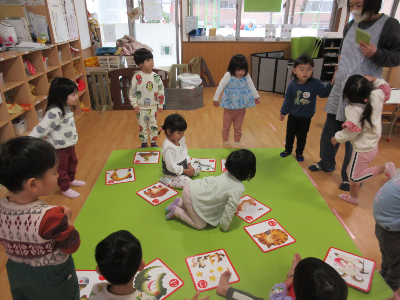 大きなかるたを借りてきてみんなでかるた大会!保育者が読み札を読み上げるとそれに合った動物の札を探して「あった!!」と嬉しそうに取っていました♪初かるたの子もいましたが、何回戦かするうちにルールを理解して取り合えるように!札が取れていない子には「ここにあるよ!」と教えてあげる優しい姿も♡