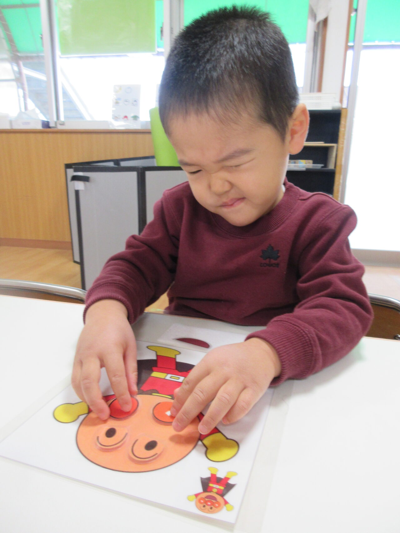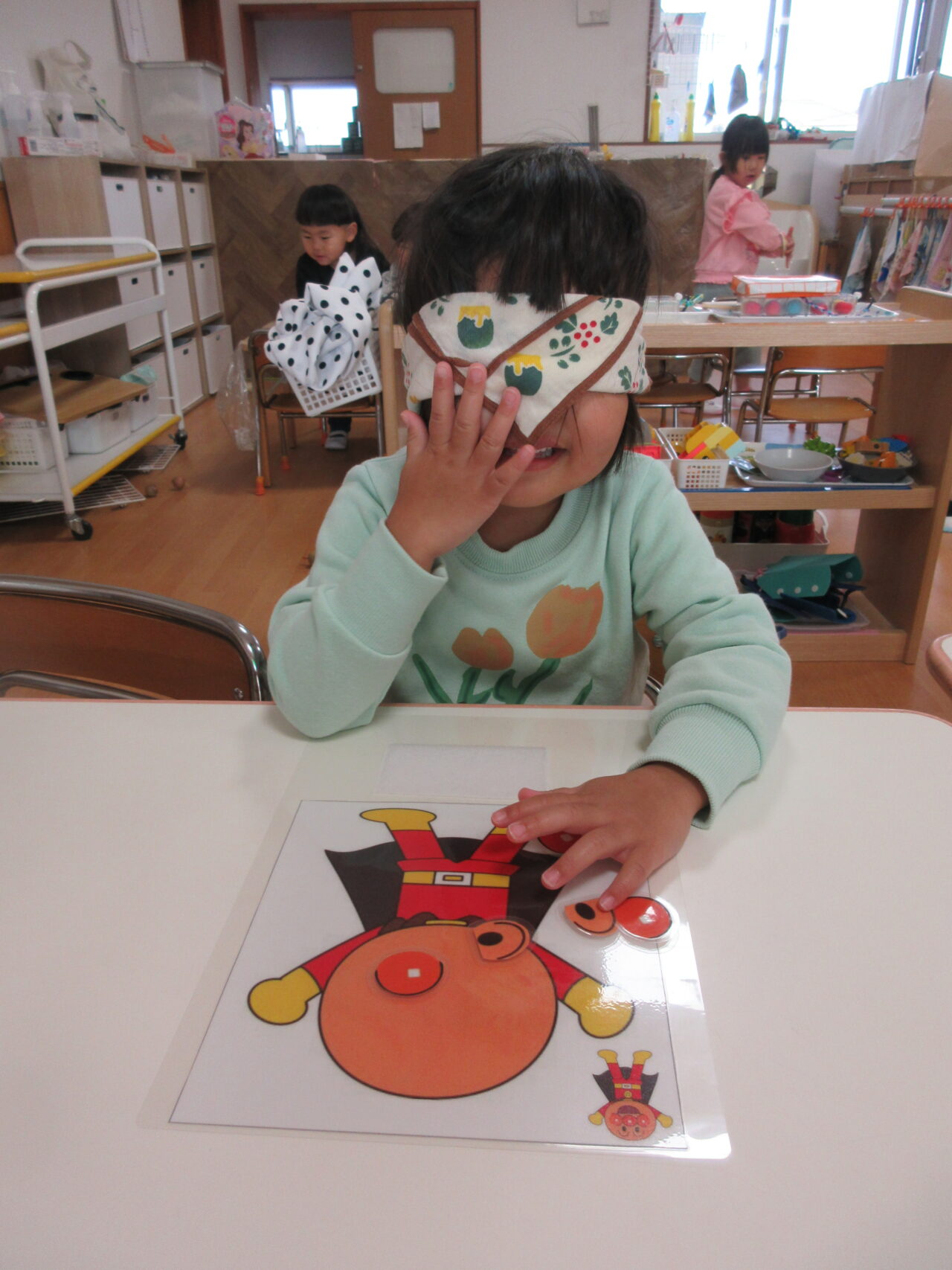 「福笑いは目を閉じて楽しむよ」と伝えていたこともあり、目を閉じて挑戦!…でもパーツを置くときにちらっと見ちゃう子どもたち🤣