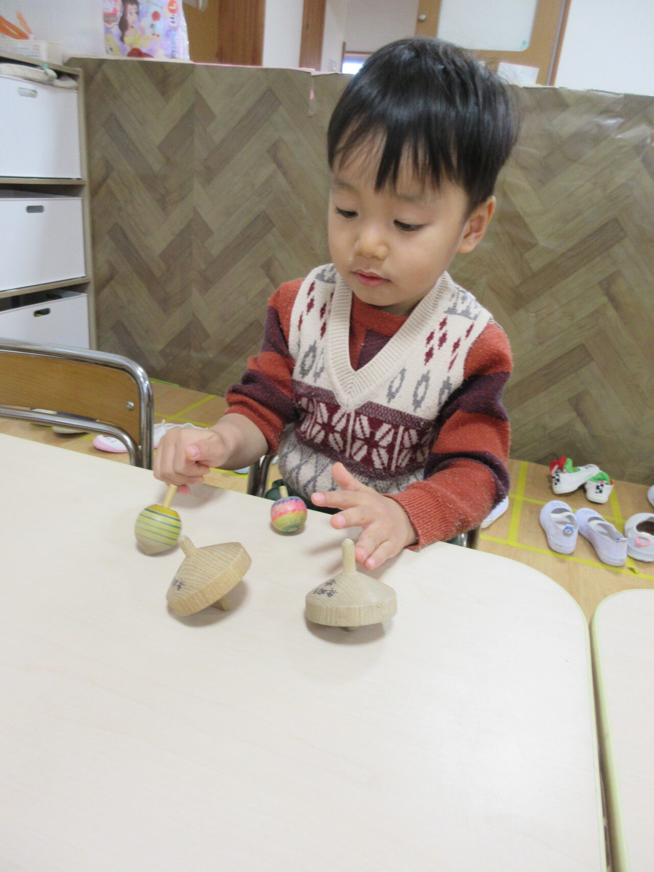 床でやって回してみたり…綺麗に回ると独楽の高さに目線を合わせてじーっとみて楽しんでいました☆