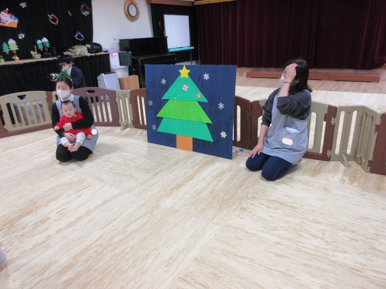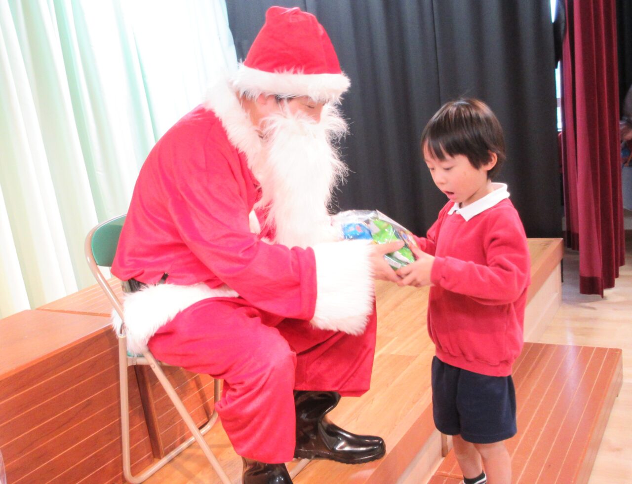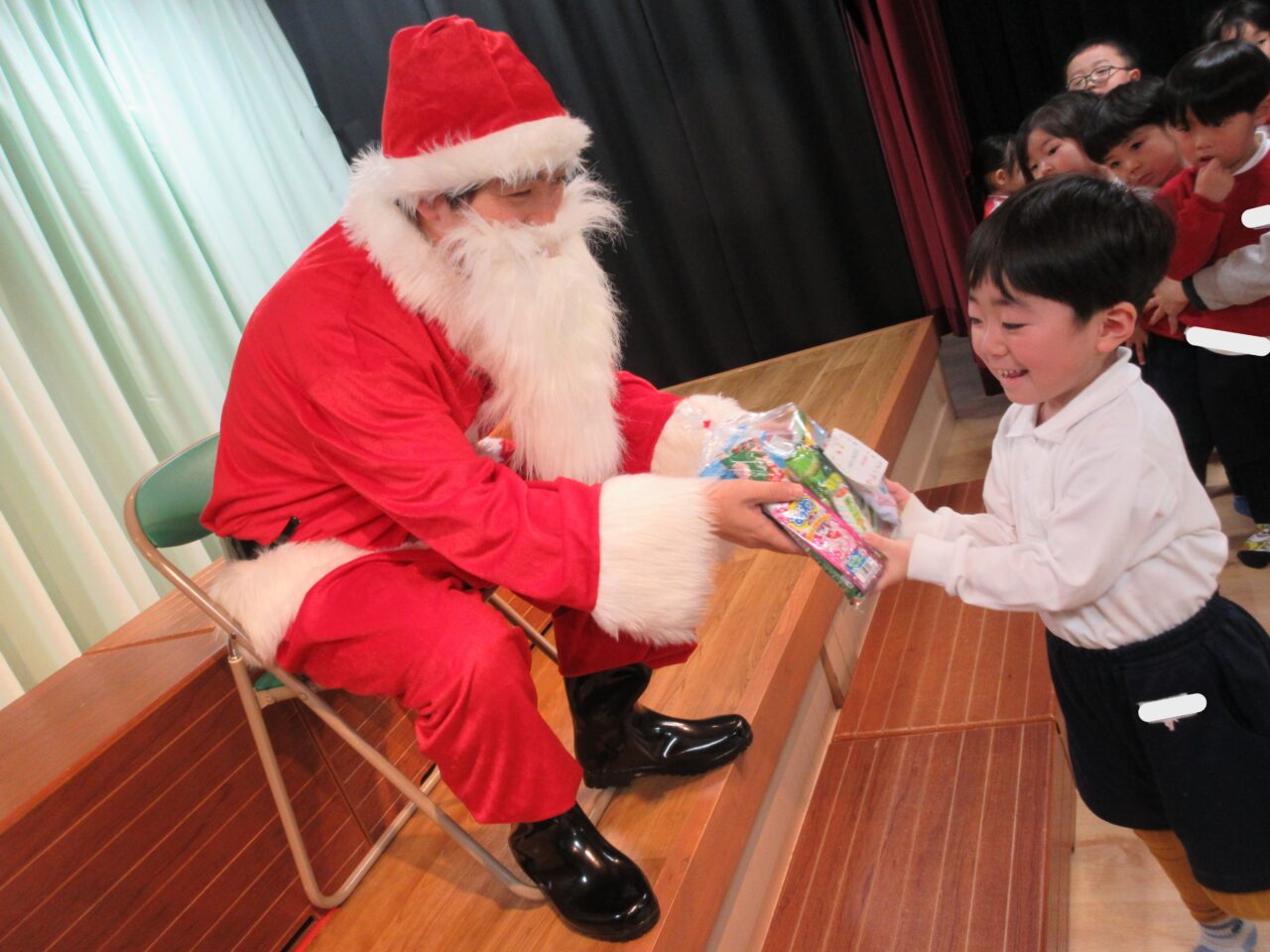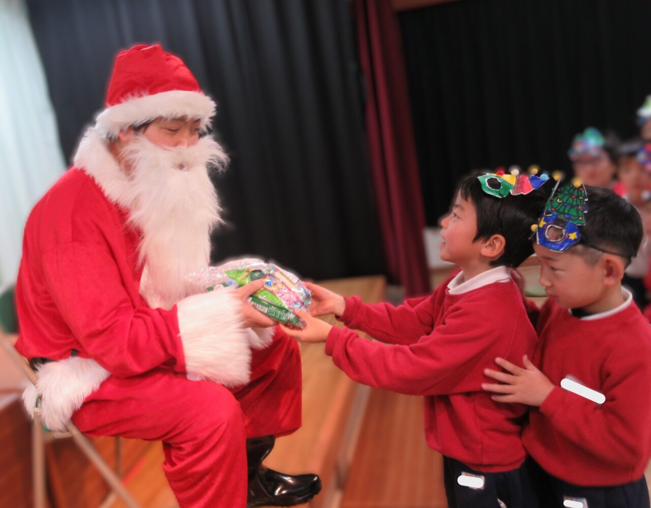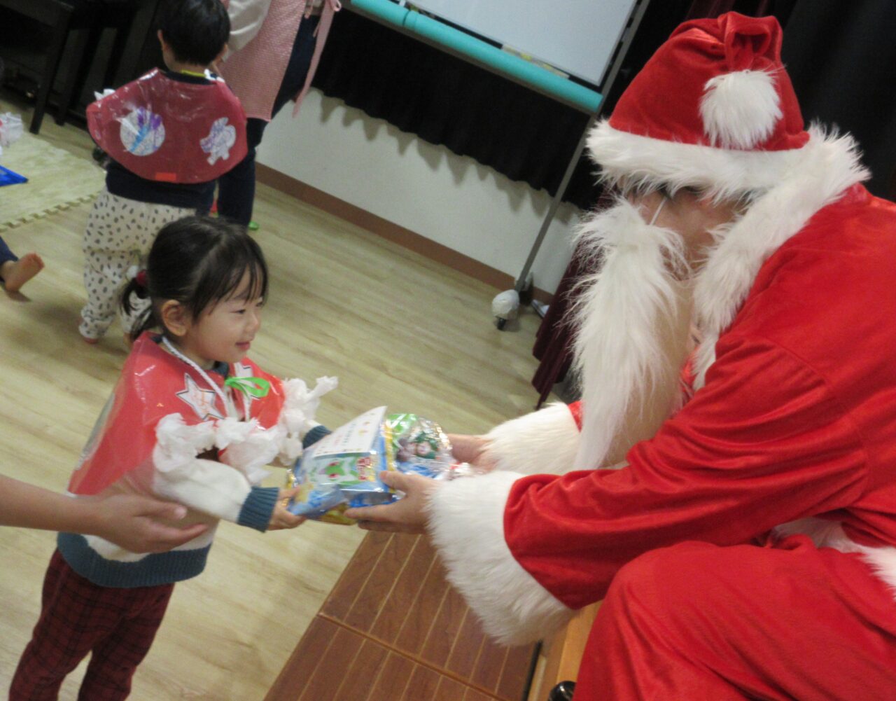 緊張した様子でしたが、泣く子が1人もおらず、プレゼントをもらうことができました♪