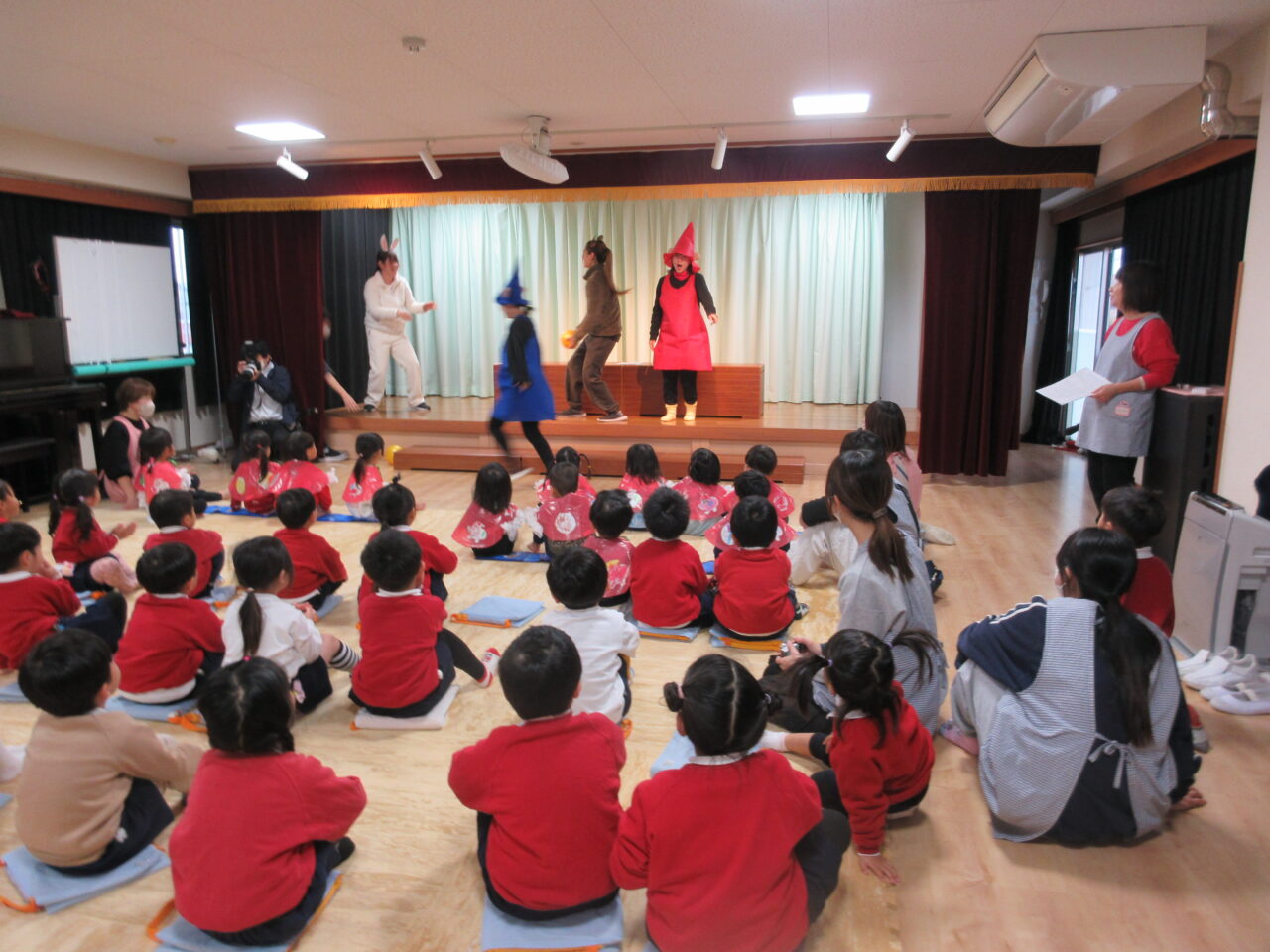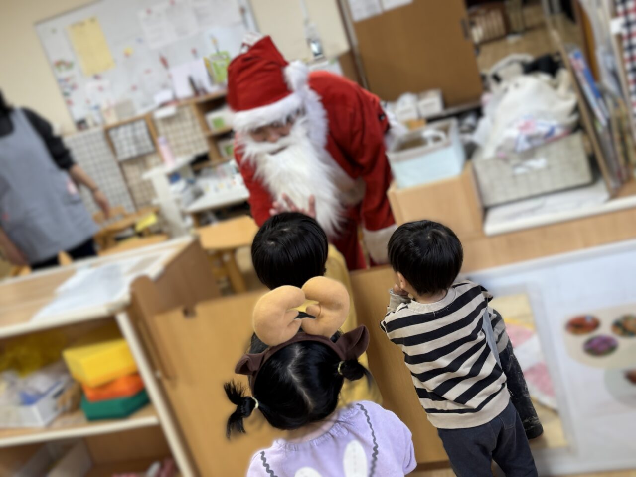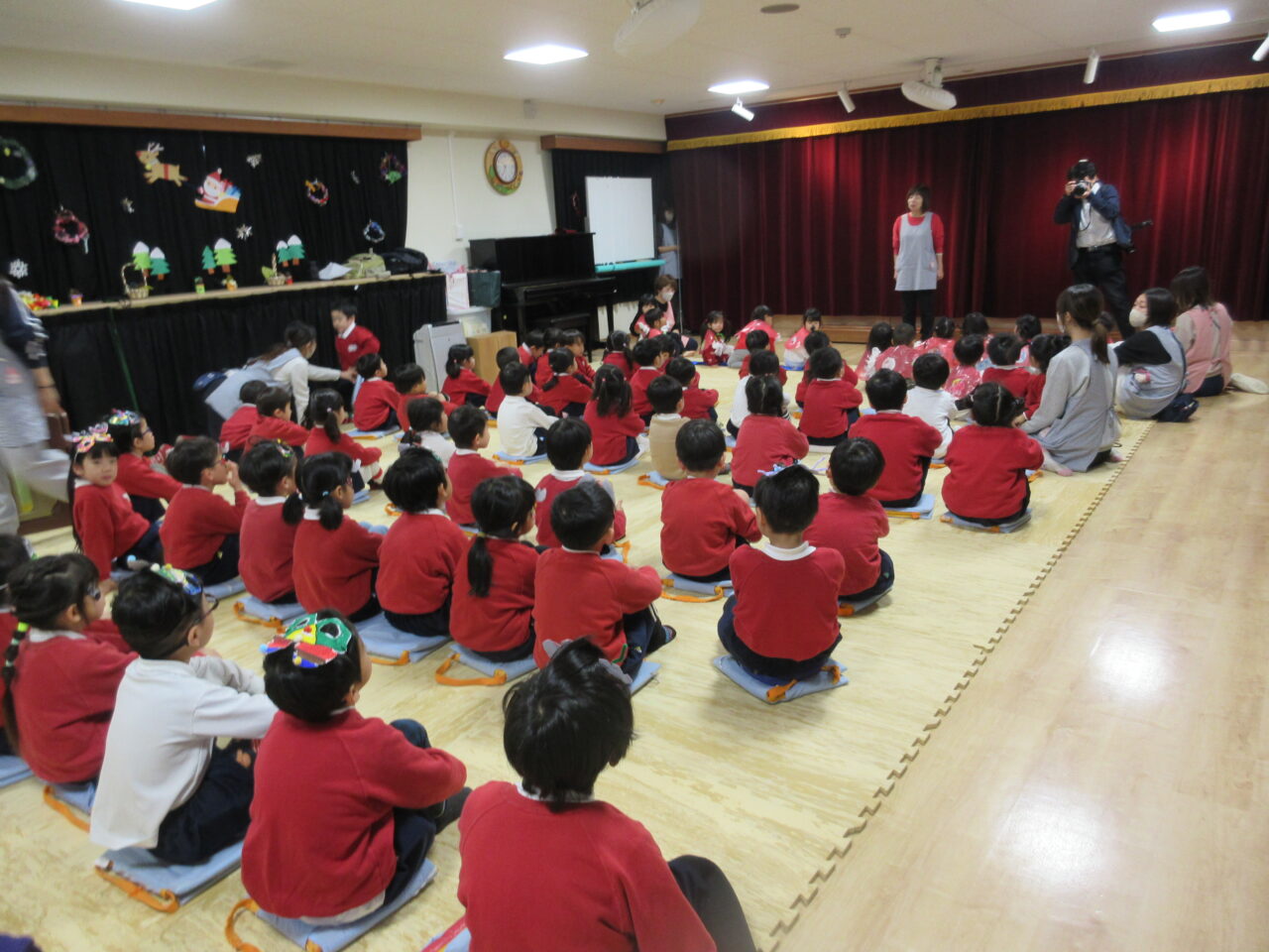 2歳以上児クラスは、先生たちのお楽しみのお話「ぐりとぐらサンタさんになれるかな?」を観て、サンタさんの登場を今か今かと待ちわびていました♪