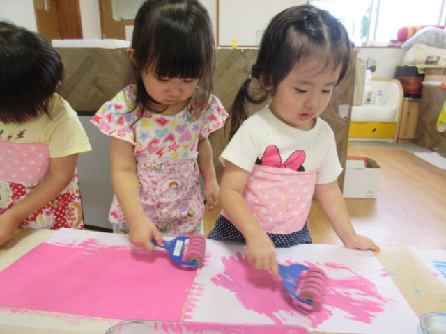 ダイナミックな遊びから指先を使う遊びまで様々な遊びを楽しめるようになってきました。そこで色々な道具を使って製作を楽しむことにしました。【ローラーを使って絵の具あそび】4色の絵の具を用意し、好きな色を選んでスタート!「この色にする!」(台紙の...